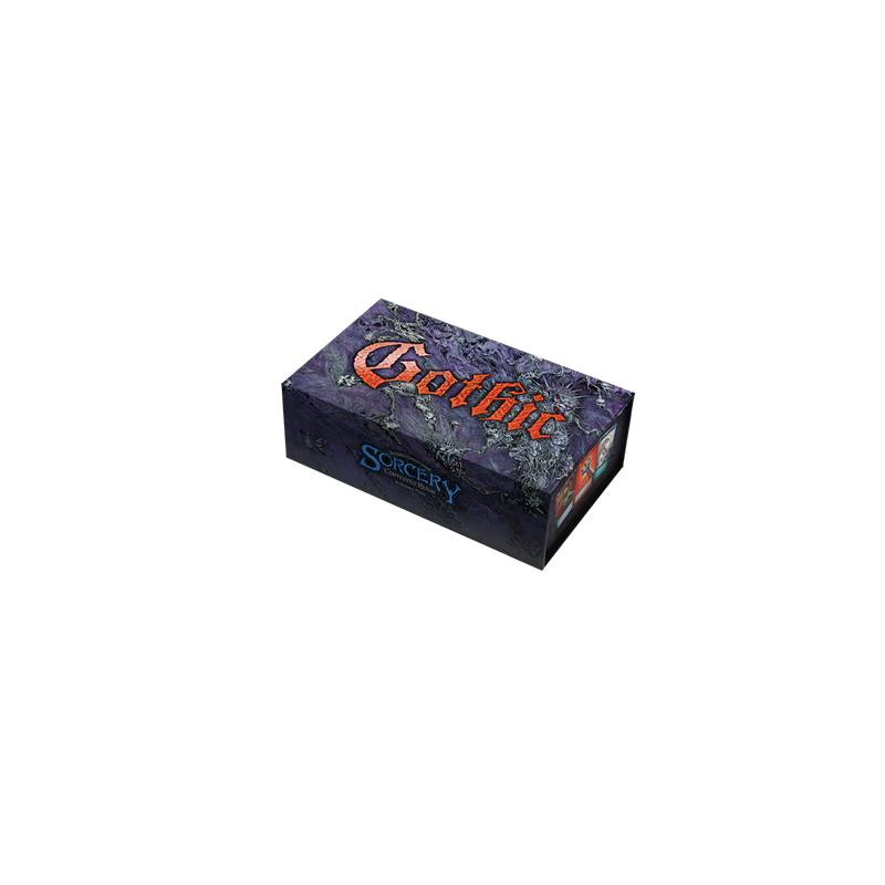 A showcase 36 pack booster box, using ‘The Void’ art for Ian Miller and the Gothic logo prominently in red. The box is designed to be slightly more substantial than regular TCG boxes and features a magnetic seal, so our players can customize the box and use it for impromptu storage.